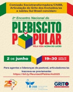 O Plebiscito Popular 2025 busca ouvir a população sobre questões fundamentais para a construção de um Brasil mais justo e democrático. Vai consultar a população sobre temas que estão entre os mais relevantes na atualidade: a redução da jornada de trabalho sem redução de salário; o fim da escala 6x; a taxação dos mais ricos, que ganham acima de R$ 50 mil, e isenção de imposto de renda para quem ganha até R$ 5 mil.O primeiro encontro nacional, realizado em 29 de abril pela Cepast-CNBB, Grito e JSB, foi no marco do lançamento oficial da campanha, destacando a importância da participação popular no processo. Agora, o segundo encontro virtual pretende avançar na organização das ações, discutir estratégias de mobilização e fortalecer a rede de articulação em todo o território nacional.