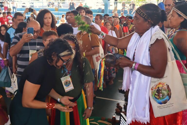 A força das mulheres e da espiritualidade estava presente desde o início da celebração de abertura na grande tenda, movida pelas músicas e cantos populares do campo, das águas e das florestas, seguida da defumação e benzimento, a fim de pedir licença e purificar a manhã de atividades e programações do primeiro dia.