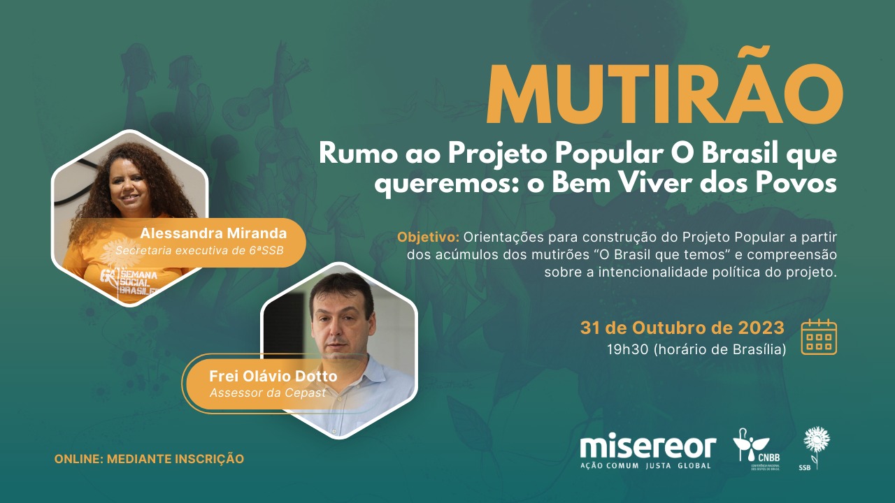Segundo os assessores, o objetivo desse Mutirão é oferecer orientações e dialogar sobre a intencionalidade política do Projeto Popular, a partir dos acúmulos dos Mutirões acerca de “O Brasil que temos”. O prazo para as inscrições é até às 17h do dia 31 de outubro, através deste link: https://forms.gle/FyirugBi13YdNMiA6