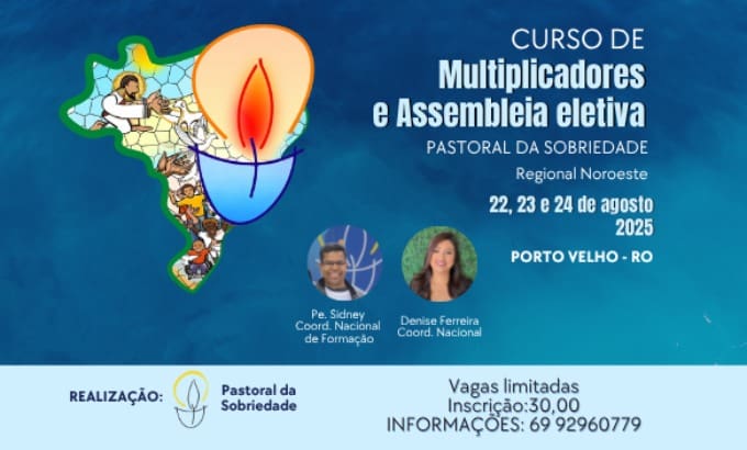 A Pastoral da Sobriedade organizada no Regional Noroeste da Conferência Nacional dos Bispos do Brasil (CNBB), vai realizar nos dias 22, 23 e 24 de agosto de 2025, em Porto Velho (RO), o Curso de Multiplicadores para agentes já capacitados.