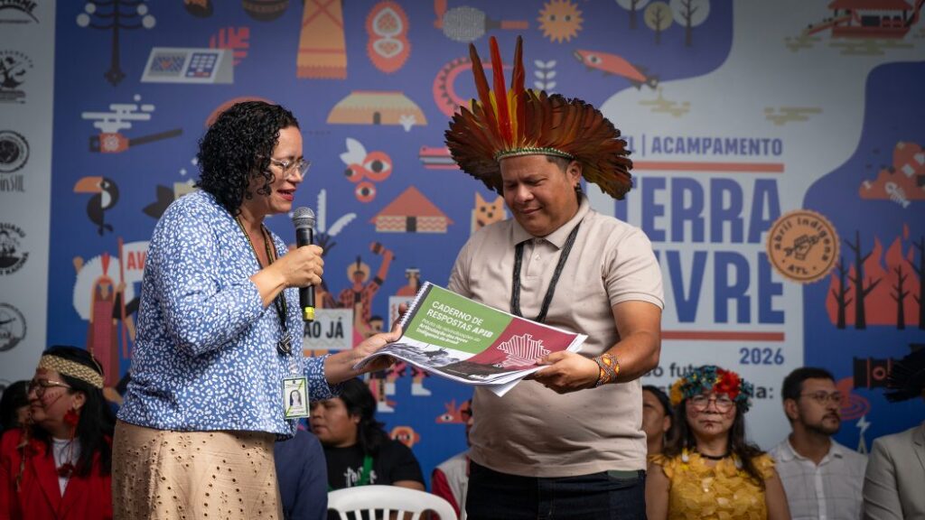 O momento foi marcado pela entrega de um Caderno de Respostas da Articulação dos Povos Indígenas do Brasil à Apib pela Secretaria-Geral da Presidência da República, com respostas do governo à demandas apresentadas pelo movimento indígena através da Apib no Acampamento Terra Livre de 2025.