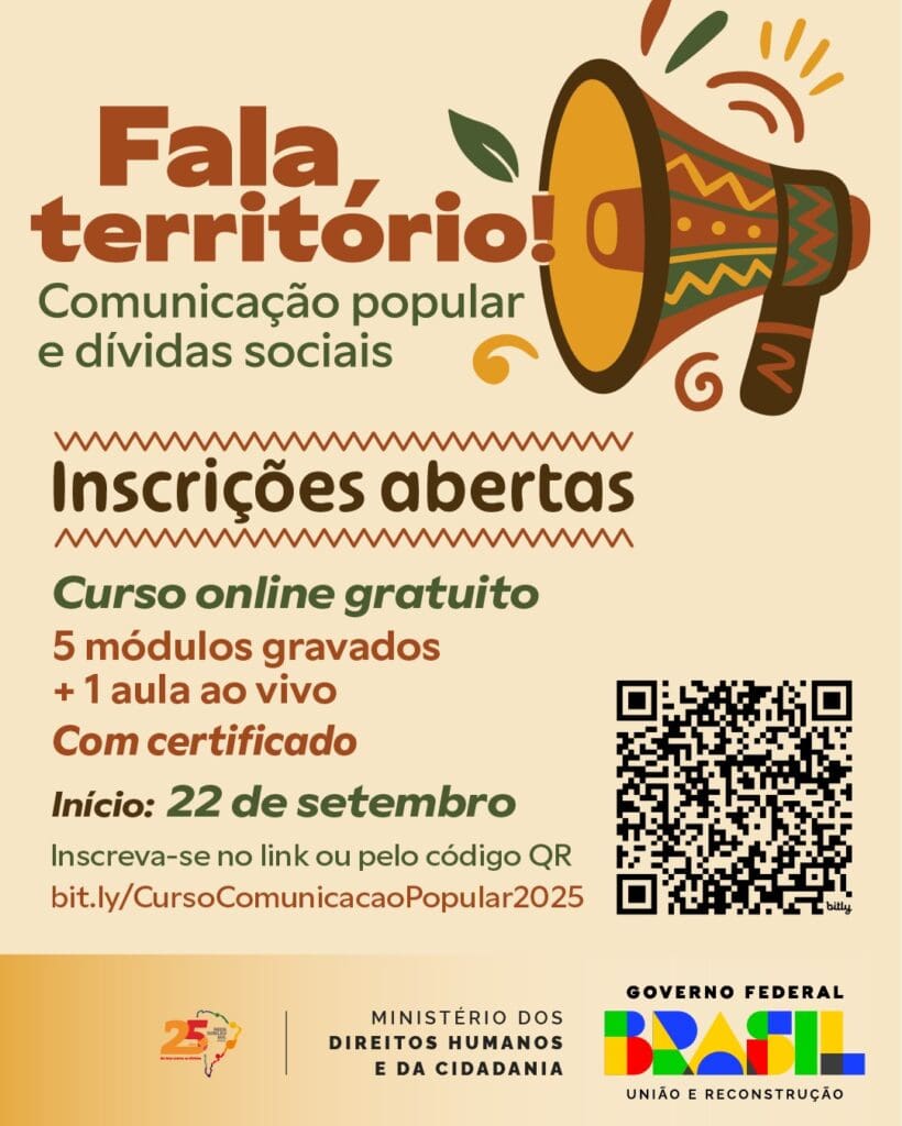 A Rede Jubileu Sul Brasil (JSB) está com inscrições abertas para o “Fala, Território! Comunicação Popular e Dívidas Sociais”, um curso online e gratuito que visa capacitar comunicadores, lideranças comunitárias e ativistas sociais. Com início em 22 de setembro, a formação tem duração de seis semanas e certificado.