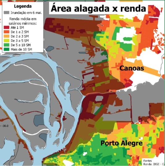 O mapa abaixo gerado pelo Núcleo Porto Alegre do Observatório das Metrópoles demonstra de maneira inequívoca o quanto as populações mais pobres foram as mais penalizadas naquele evento climático: