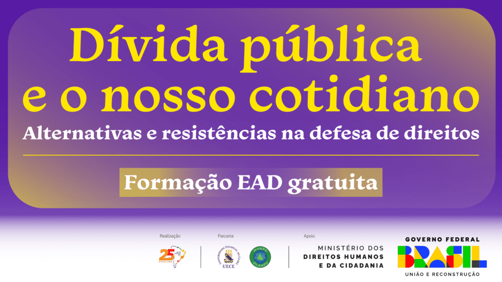 A Rede Jubileu Sul Brasil (JSB) lançou o curso online gratuito “Dívida pública e o nosso cotidiano: alternativas e resistências na defesa de direitos”, voltado a qualquer pessoa interessada em entender os efeitos do endividamento público na vida diária da população. A formação começa em 22 de julho e ocorre sempre às terças-feiras, às 19h (hora de Brasília), em aulas ao vivo com especialistas convidadas (os). As inscrições estão abertas até 20 de julho pelo formulário.