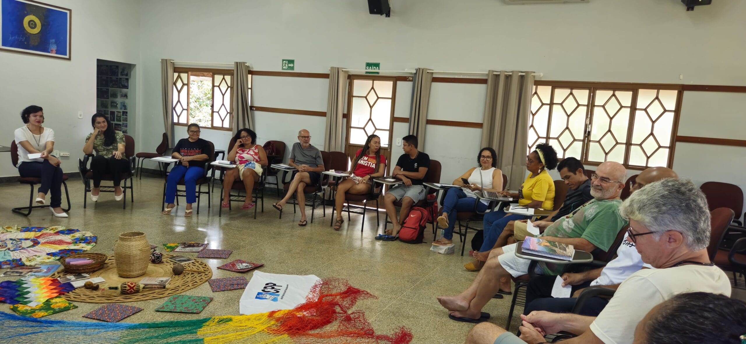 O curso é resultado da parceria entre a Articulação das Pastorais do Campo (APC) e a Universidade Federal de Goiás (UFG), por meio de convênio com a Faculdade de Direito e com o Programa de Pós-Graduação em Direito Agrário (PPGDA) para agentes das pastorais que atuam na luta pelos direitos dos povos tradicionais. Em quatro grandes encontros em dois anos, o Centro de Formação Vicente Cañas foi espaço de partilha de conhecimento e resistência. Na manhã daquele sábado (15), ao abrir as portas da sala de encontro padre Paulo Günther Suess, o momento era de felicidade. Agentes e professores reunidos diante de uma mandala colorida exposta ao chão e composta por vários símbolos que representam os povos e as suas lutas, partilhavam saberes e alegrias.