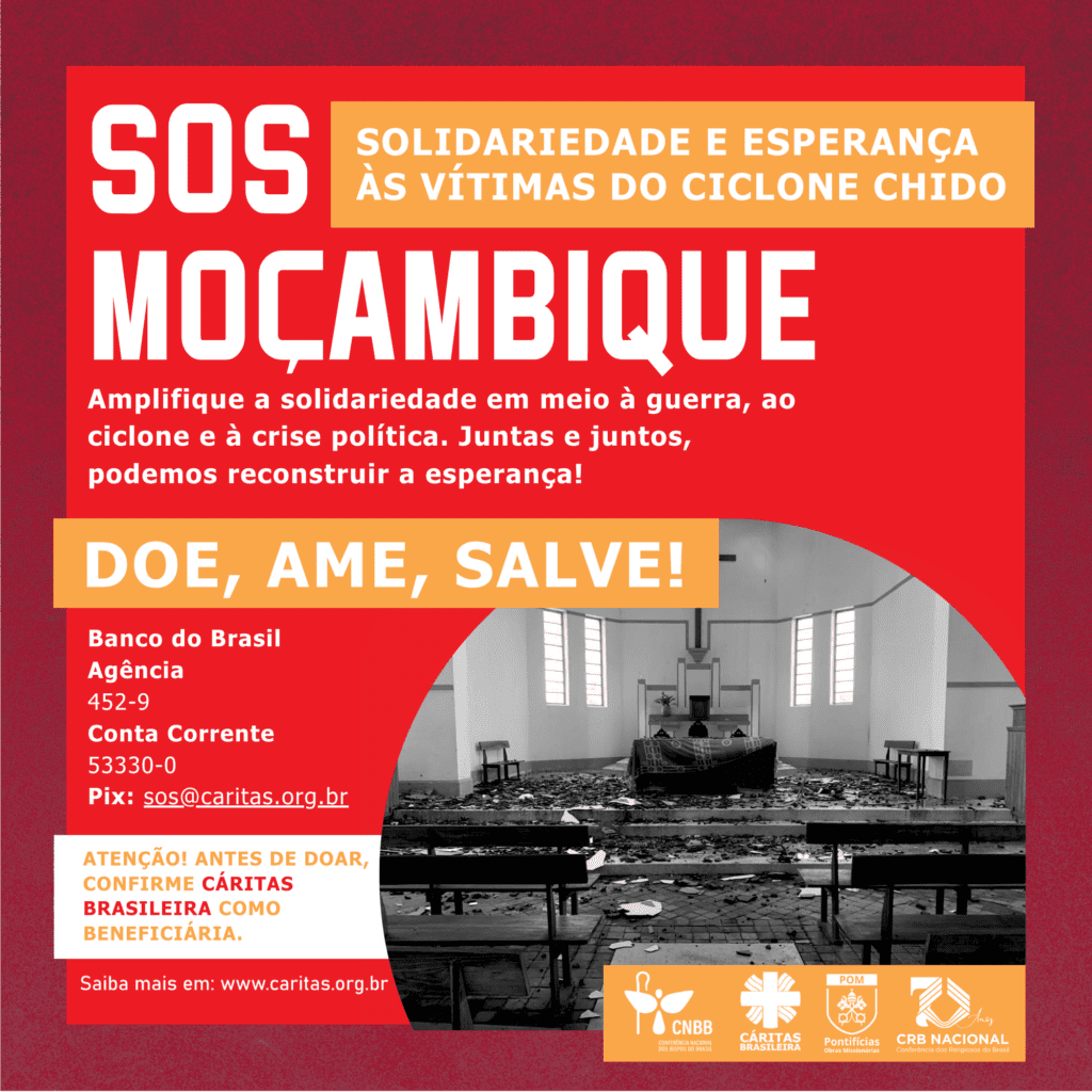 Em resposta a este cenário, a Conferência Nacional dos Bispos do Brasil (CNBB), a Cáritas Brasileira, a Conferência dos Religiosos do Brasil (CRB) e as Pontifícias Obras Missionárias (POM) uniram forças para lançar a campanha “SOS Moçambique”. O objetivo é mobilizar, de maneira emergencial, recursos destinados à Diocese de Pemba, viabilizando a aquisição de itens essenciais e o suporte humanitário imediato.