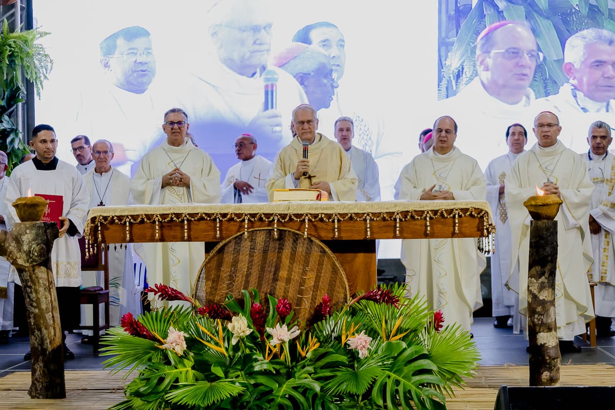 A missa de abertura, presidida pelo cardeal arcebispo de Manaus, dom Leonardo Ulrich Steiner, e concelebrada por dezenas de bispos e padres, reuniu os quase 400 participantes, mais de 200 voluntários e representantes da Igreja de todo Brasil. Celebrada em um espaço decorado com a alma da Amazônia, a liturgia foi uma declaração sensível do compromisso que une fé, cultura e cuidado com a Casa Comum. Ali estavam símbolos, cores e texturas que comunicam os quem vive nas margens dos rios e caminha sobre a terra molhada da floresta.