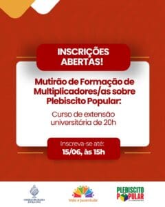 Por Coletivo de Comunicação – Plebiscito Popular A Comissão Brasileira Justiça e Paz (CBJP), em sintonia com a Rede Brasileira Justiça e Paz, convida para o Mutirão de Formação de Multiplicadores/as sobre Plebiscito Popular, um curso de extensão universitária de 20 horas com três encontros ao vivo pelo YouTube: dias 16, 23 e 30 de junho (segundas-feiras), das 20h às 22h (hora de Brasília).Para participar, inscreva-se até 15 de junho, às 15h clicando aqui O curso nacional é aberto e gratuito, voltado a militantes de movimentos sociais, pastorais, estudantes, professoras/es, comunicadoras/es populares e demais pessoas interessadas em articular a mobilização local do Plebiscito Popular. O objetivo é divulgar o plebiscito nas comunidades, organizar mutirões de coleta de votos e debater os temas centrais da campanha. O certificado será emitido pelo Vida e Juventude – Centro Popular de Formação da Juventude, que mantém parceria com a Cátedra para Juventude da UNESCO na Universidade Católica de Brasília.